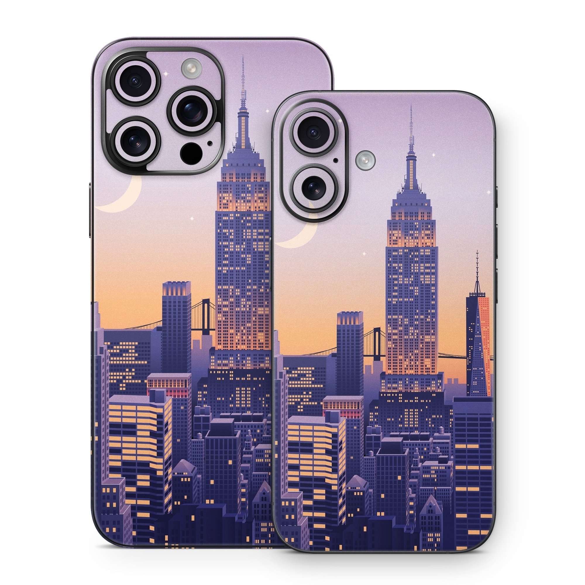 iStyles iPhone 16 Series Skin design of Skyscraper, Building, Sky, Atmosphere, Moon, World, Nature, Tower, Afterglow, Dusk, with blue, purple, yellow, orange colors, and tagged with urban, space, empire, state, building, new, york, skyline, brooklyn, bridge, moon, stars.
