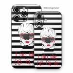 iStyles iPhone 16 Series Skin design of Rectangle, Font, Gesture, Eyewear, Art, Technology, Personal protective equipment, Goggles, Logo, Eyelash, with black, white, yellow, red colors, and tagged with signs, objects, people, patterns, blackandwhite, girl, glasses, red, stripes, only, have, eyes, for, you.