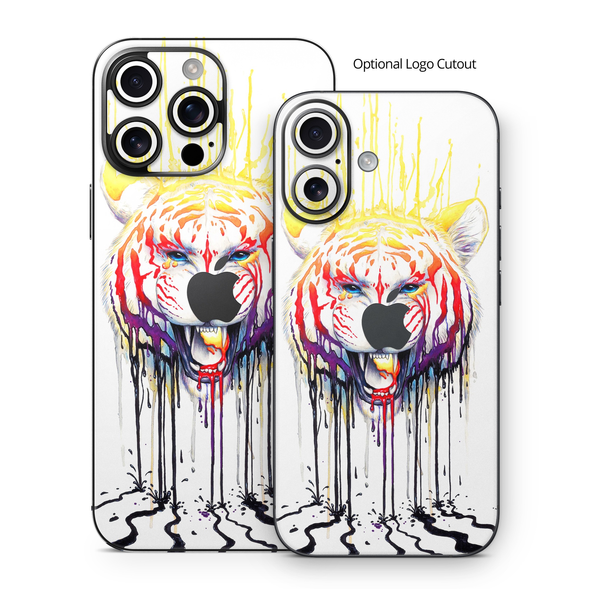 iStyles iPhone 16 Series Skin design of Jaw, Roar, Organism, Gesture, Art, Font, Felidae, Painting, Illustration, Drawing, with white, black, yellow, red, orange, purple colors, and tagged with animals, paint, rainbow, tiger.