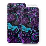 iStyles iPhone 16 Series Skin design of Pattern, Purple, Violet, Turquoise, Teal, Design, Floral design, Visual arts, Magenta, Motif, with black, purple, blue colors, and tagged with flowers, patterns.
