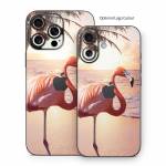 iStyles iPhone 16 Series Skin design of Flamingo, Greater flamingo, Bird, Water bird, Pink, Wildlife, Sky, Tree, Organism, Beak, with pink, blue, green, yellow, white, orange, black colors, and tagged with animals, nature, animal, animals, beach, bird, birds, flamingo, ocean, palm, palmtrees, pink, sunset, tropical, tropics.