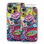 iStyles iPhone 16 Series Skin design of Psychedelic art, Pattern, Visual arts, Art, Design, Textile, Illustration, Plant, Graphic design, Drawing, with pink, yellow, black, blue, white colors, and tagged with animals, flowers, animals, bright, colorful, flamingo, flowers, spring, summer, tropical.