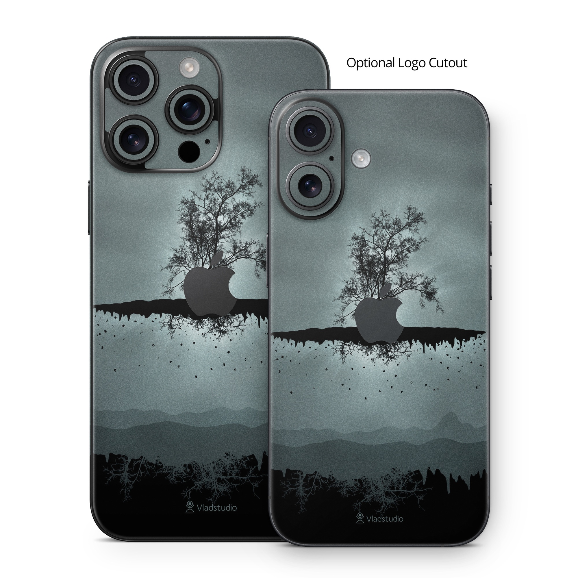 iStyles iPhone 16 Series Skin design of Reflection, Sky, Nature, Water, Black, Tree, Black-and-white, Monochrome photography, Natural landscape, Atmospheric phenomenon, with black, gray, blue colors, and tagged with nature, fantasy.