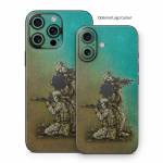 iStyles iPhone 16 Series Skin design of Art, Sculpture, Landscape, Illustration, Visual arts, Wood, Drawing, Fictional character, Soil, Circle, with blue, green, white, gray, brown colors, and tagged with skulls, military, objects, military, guns, buddy.