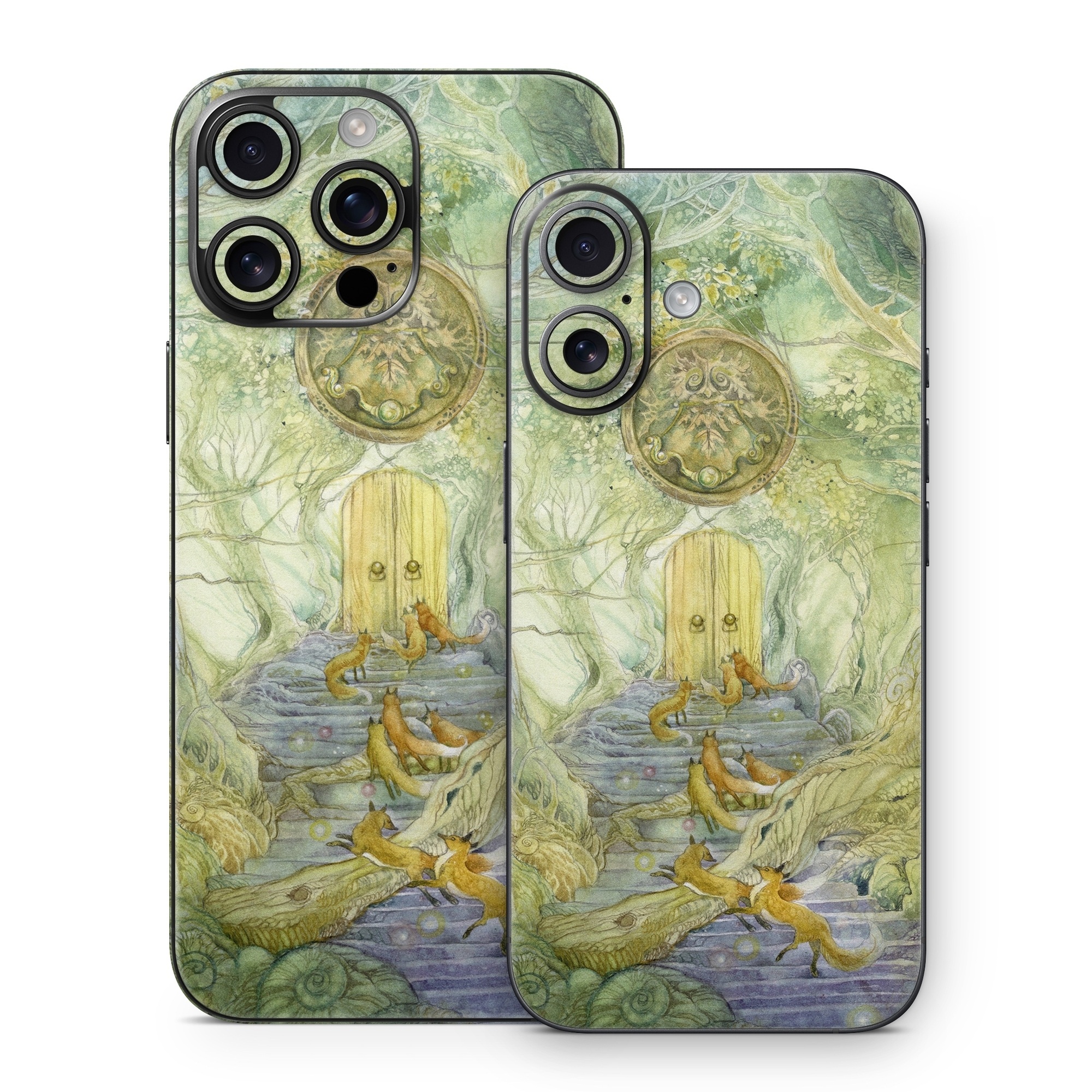 iStyles iPhone 16 Series Skin design of Painting, Art, Mythology, Visual arts, Watercolor paint, Organism, Fictional character, Modern art, Landscape, Acrylic paint, with green, brown, red, yellow, blue, purple colors, and tagged with animals, nature, fantasy, animals, forest, fox, landscape, sci-fi, woods.