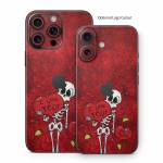 iStyles iPhone 16 Series Skin design of Font, Red, Art, Magenta, Tints and shades, Pattern, Bone, Plant, Carmine, Visual arts, with black, white, gray, red, yellow colors, and tagged with skulls, hearts, signs, love, food.