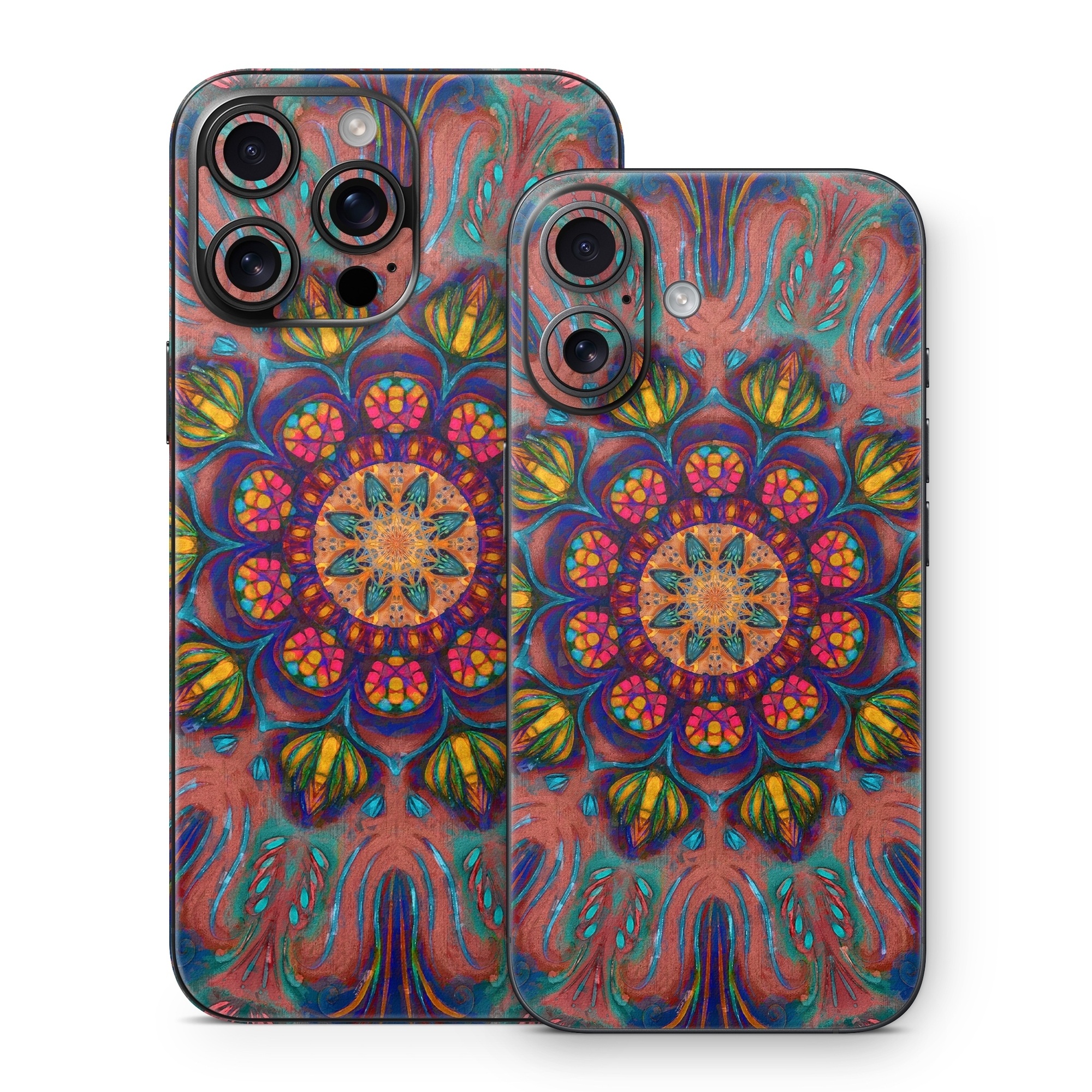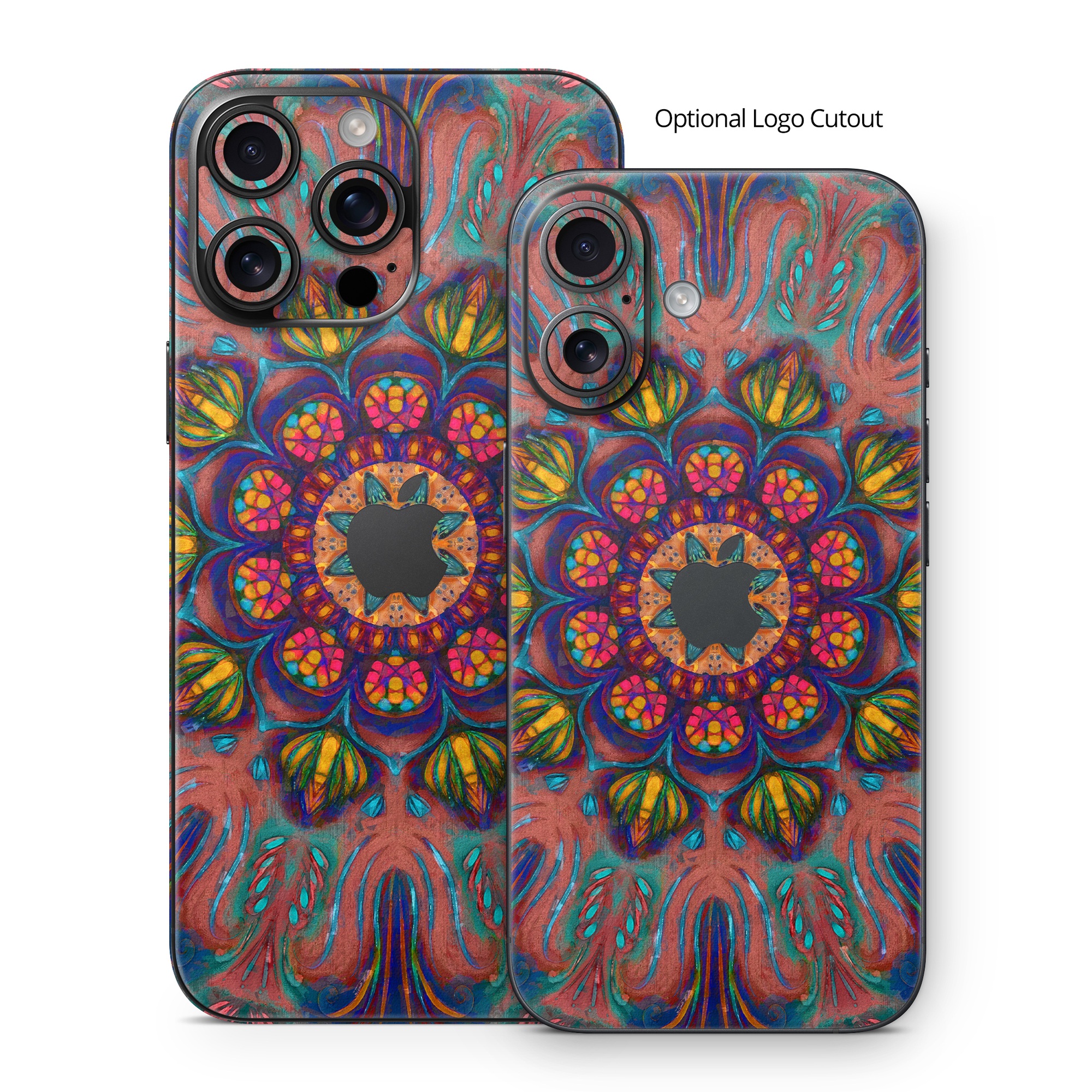 iStyles iPhone 16 Series Skin design of Psychedelic art, Pattern, Art, Textile, Symmetry, Visual arts, Design, Fractal art, Kaleidoscope, Tapestry, with blue, yellow, red, green, pink, green colors, and tagged with patterns, flowers, abstract, abstract, blue, bright, floral, flower, green, pink, teal, yellow.