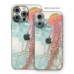 iStyles iPhone 16 Series Skin design of Jellyfish, Illustration, Water, Cnidaria, Marine invertebrates, Organism, Portuguese man o' war, Art, Nepenthes, Invertebrate, with gray, pink, yellow, red, green colors, and tagged with animals, abstract, animals, aquatic, bubbles, jellyfish, ocean, sea, sketch.