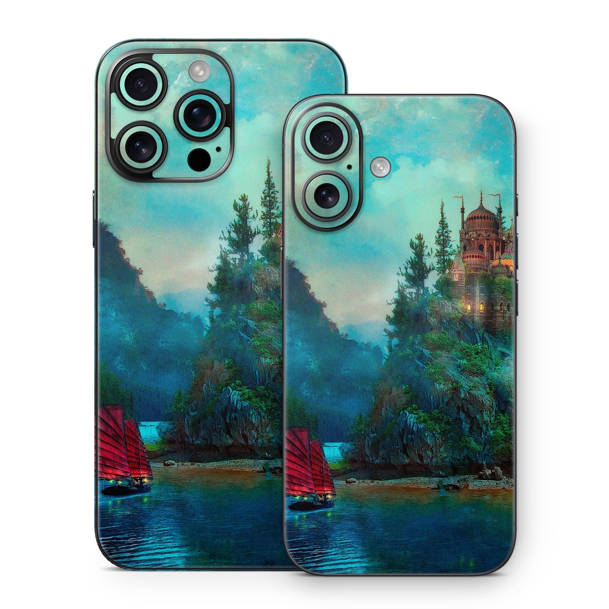 iStyles iPhone 16 Series Skin design of Nature, Natural landscape, Sky, Painting, Landscape, Illustration, Watercolor paint, Art, Calm, Water castle, with black, gray, blue, green colors, and tagged with fineart, objects, fantasy, nature, urban.