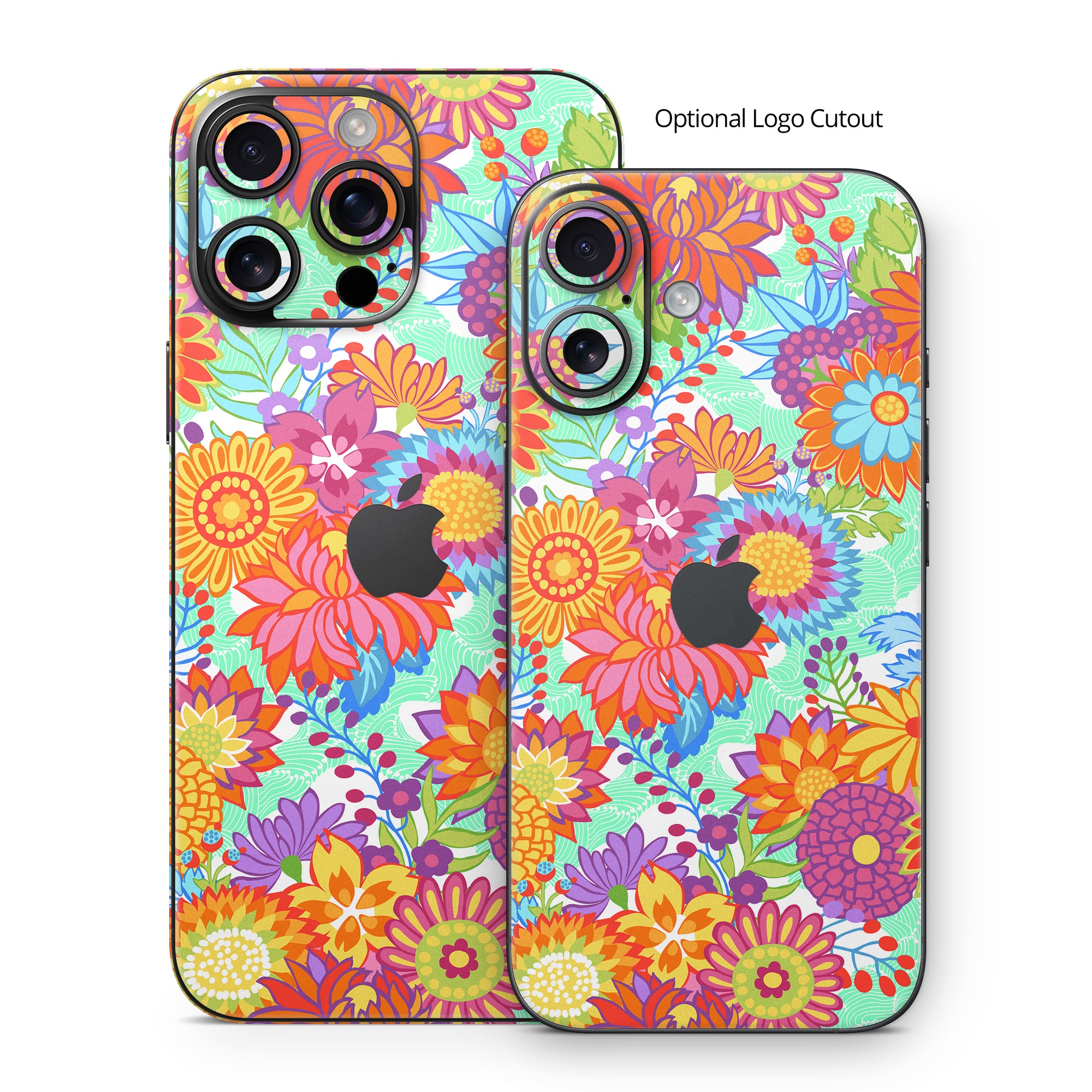 iStyles iPhone 16 Series Skin design of Pattern, Floral design, Orange, Flower, Design, Textile, Plant, Wildflower, Wrapping paper, Visual arts, with gray, orange, green, purple colors, and tagged with patterns, flowers, bright, carnival, floral, flowers, fuchsia, green, orange, pattern, pink, yellow.