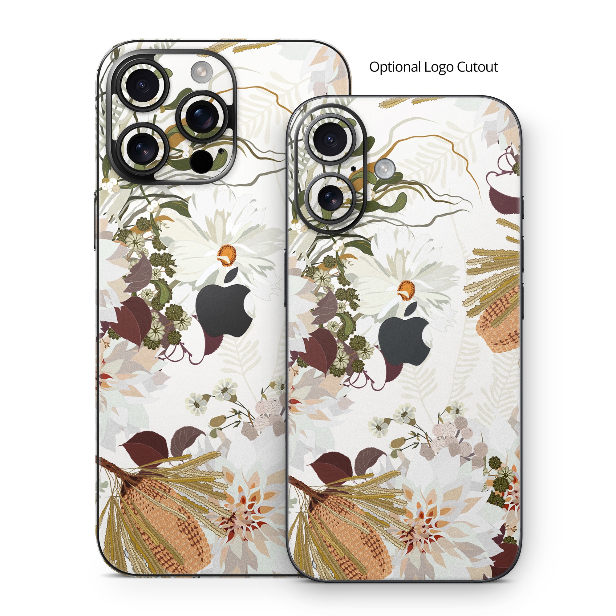 iStyles iPhone 16 Series Skin design of Flower, Botany, Plant, Floral design, Wildflower, Pattern, Wallpaper, Textile, Petal, Butterfly, with white, brown, green, gray colors, and tagged with nature, patterns, flowers, brown, cream, filigree, floral, flower, flowers, green, leaf, leaves, nature, neutral, outdoor.