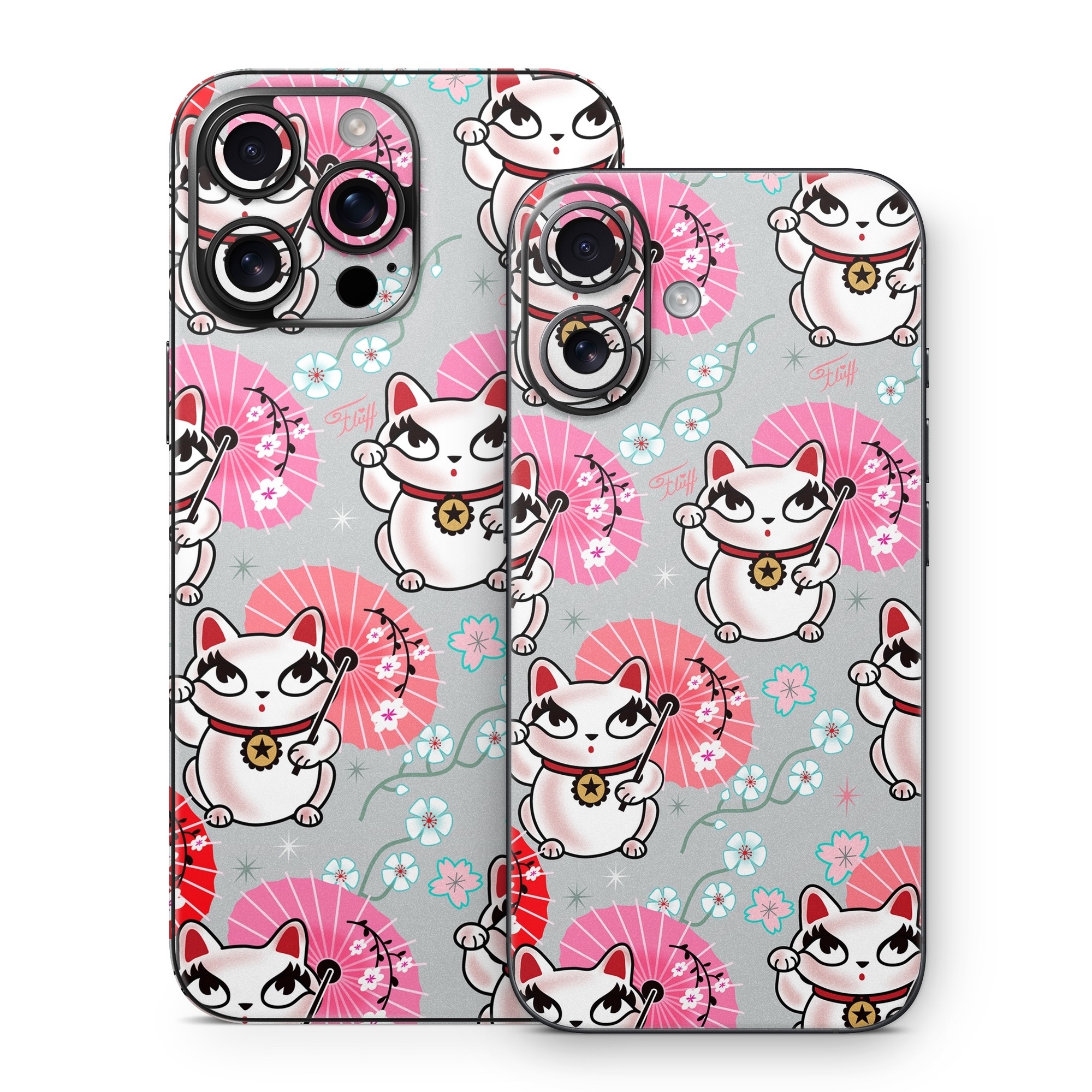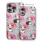 iStyles iPhone 16 Series Skin design of Pink, Red, Cartoon, Design, Line, Textile, Pattern, Illustration, Smile, Fictional character, with white, red, pink, gray, blue, black colors, and tagged with patterns, animals, objects, cat, cats, fantasy, flower, flowers, grey, pink.