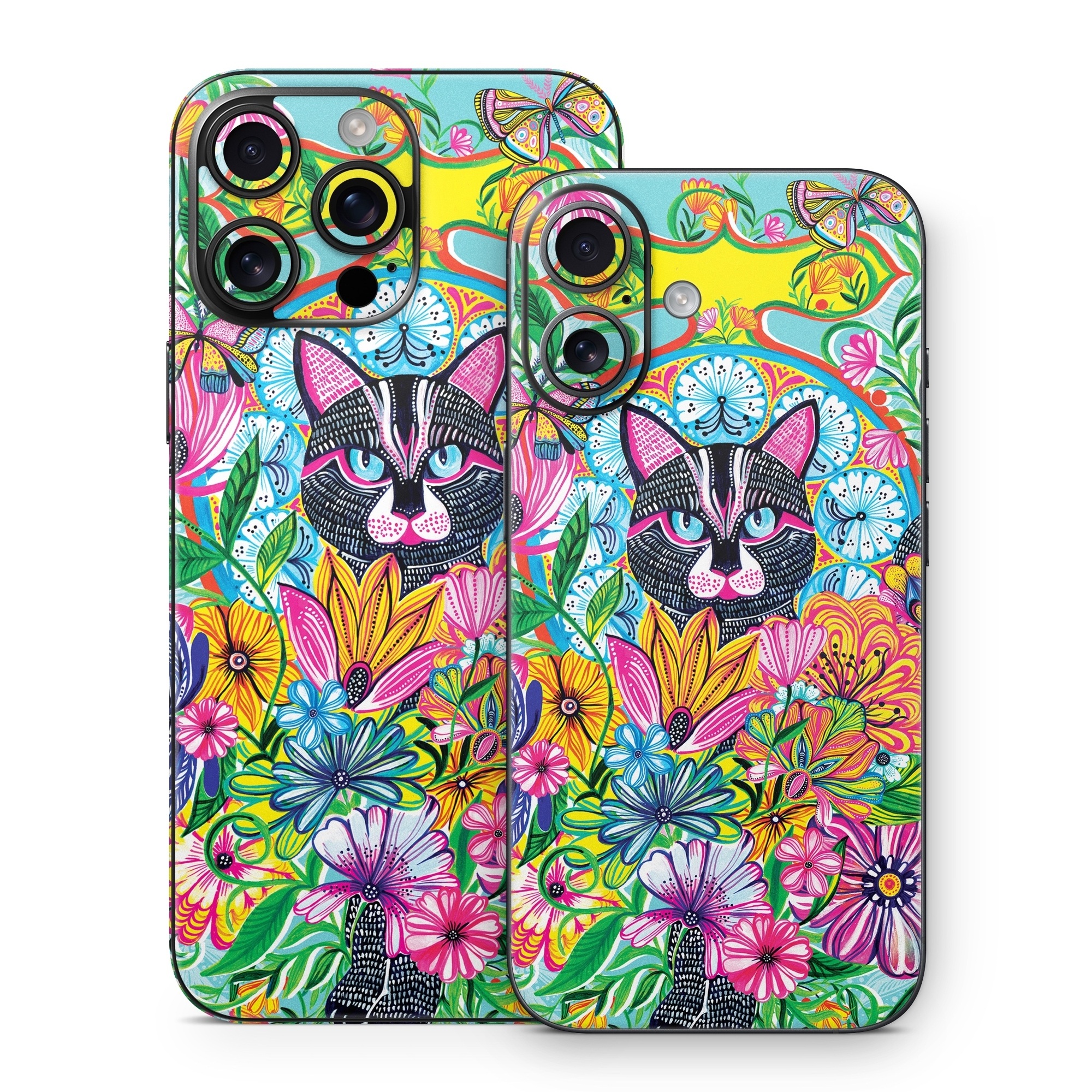 iStyles iPhone 16 Series Skin design of Visual arts, Art, Plant, Illustration, Pattern, Floral design, Flower, Wildflower, with white, blue, pink, black, green, yellow colors, and tagged with animals, flowers, signs, animal, bright, cat, cats, colorful, flowers, kitten, kitty.