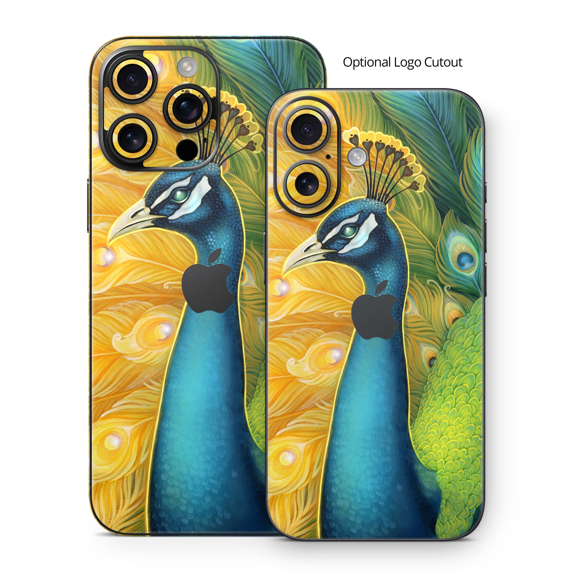 iStyles iPhone 16 Series Skin design of Bird, Peafowl, Phasianidae, Beak, Organism, Art paint, Galliformes, Art, Feather, Painting, with yellow, orange, green, blue, white, black colors, and tagged with fantasy, animals, patterns, peacock, peahen, peafowl, feathers.