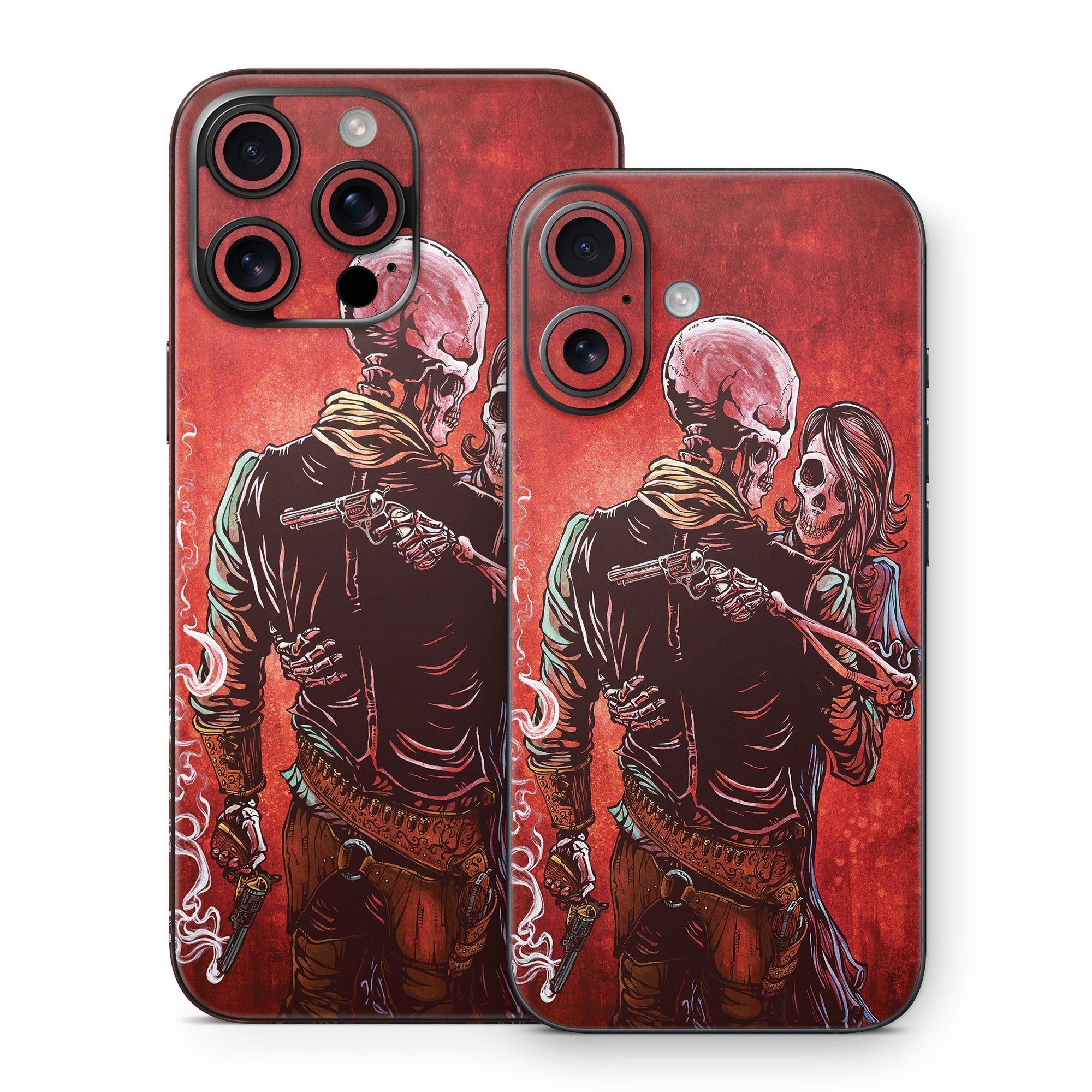 iStyles iPhone 16 Series Skin design of Sleeve, Gesture, Painting, Art, Artist, Fictional character, Drawing, Paint, Illustration, Visual arts, with red, black, white, gray, brown colors, and tagged with skulls, objects, honesty, mistrust, faith, smoking, gun, couple.