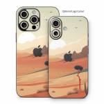 iStyles iPhone 16 Series Skin design of Sky, Bird, Ecoregion, Light, Nature, Cloud, Natural environment, Moon, Natural landscape, Biome, with orange, yellow, brown, green, white, black colors, and tagged with nature, animals, desert, landscape, distance, birds, sunset, sand.