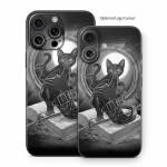 iStyles iPhone 16 Series Skin design of Cat, Boot, Book, Wand, Shoelace, Mirror, with black, white, gray colors, and tagged with animals, objects, animals, cat, cats, goth, gothic, kitten, magic, witch, witchcraft, witches.