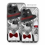iStyles iPhone 16 Series Skin design of Cartoon, Poster, Font, Illustration, Headgear, Games, Photo caption, Fictional character, Graphic design, Hat, with black, white, red colors, and tagged with skulls, objects, patterns, 1920's, artdeco, blackandwhite, calavera, dayofthedead, diadelosmuertos, flapper, greatgatsby, newmexico, pattern, skeleton, skull, sugarskull, vanderbone, wine.