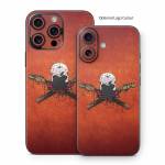 iStyles iPhone 16 Series Skin design of Sleeve, Orange, Skull, Font, Bone, Art, T-shirt, Symbol, Circle, Emblem, with black, white, gray, brown, red, green colors, and tagged with skulls, flowers, objects, music, guitar, roses, rock, roll.
