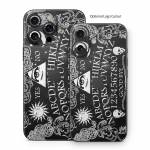 iStyles iPhone 16 Series Skin design of Text, Font, Pattern, Design, Illustration, Headpiece, Tiara, Black-and-white, Calligraphy, Hair accessory, with black, white, gray colors, and tagged with signs, skulls, black, demons, ghosts, magic, magick, paranormal, skull, spirit, talking.