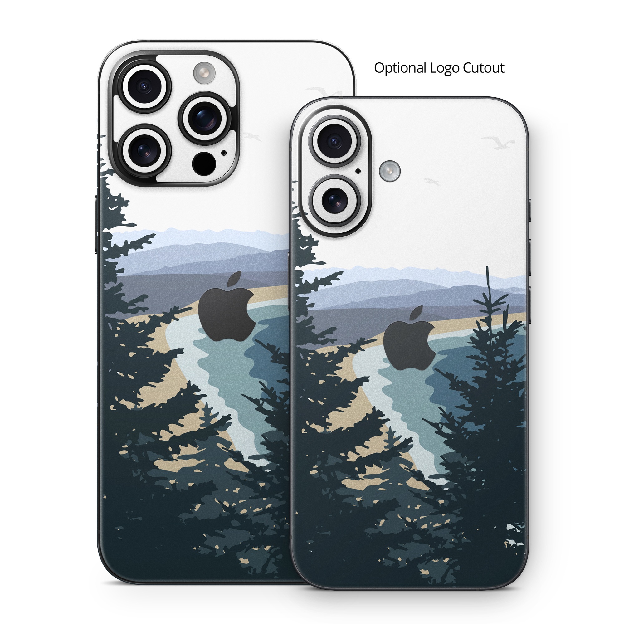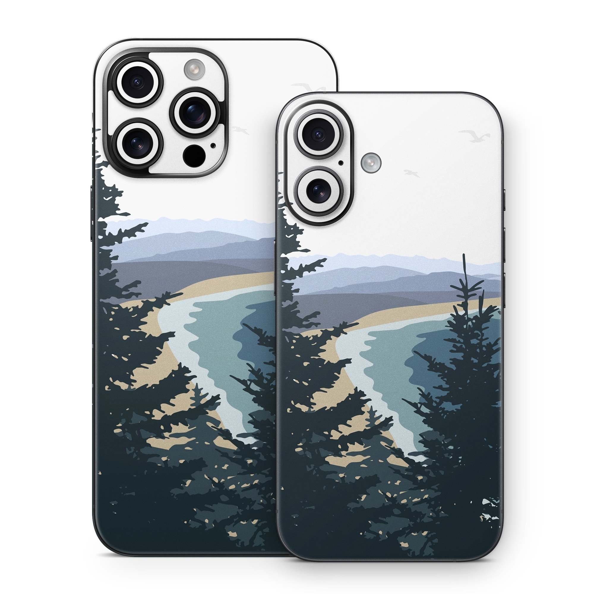 iStyles iPhone 16 Series Skin design of Sky, Plant, Mountain, Natural landscape, Branch, Larch, Tree, Highland, Atmospheric phenomenon, Evergreen, with white, blue, yellow, gray, black, green colors, and tagged with nature, animals, ocean, beach, landscape, forest, trees, seagulls.