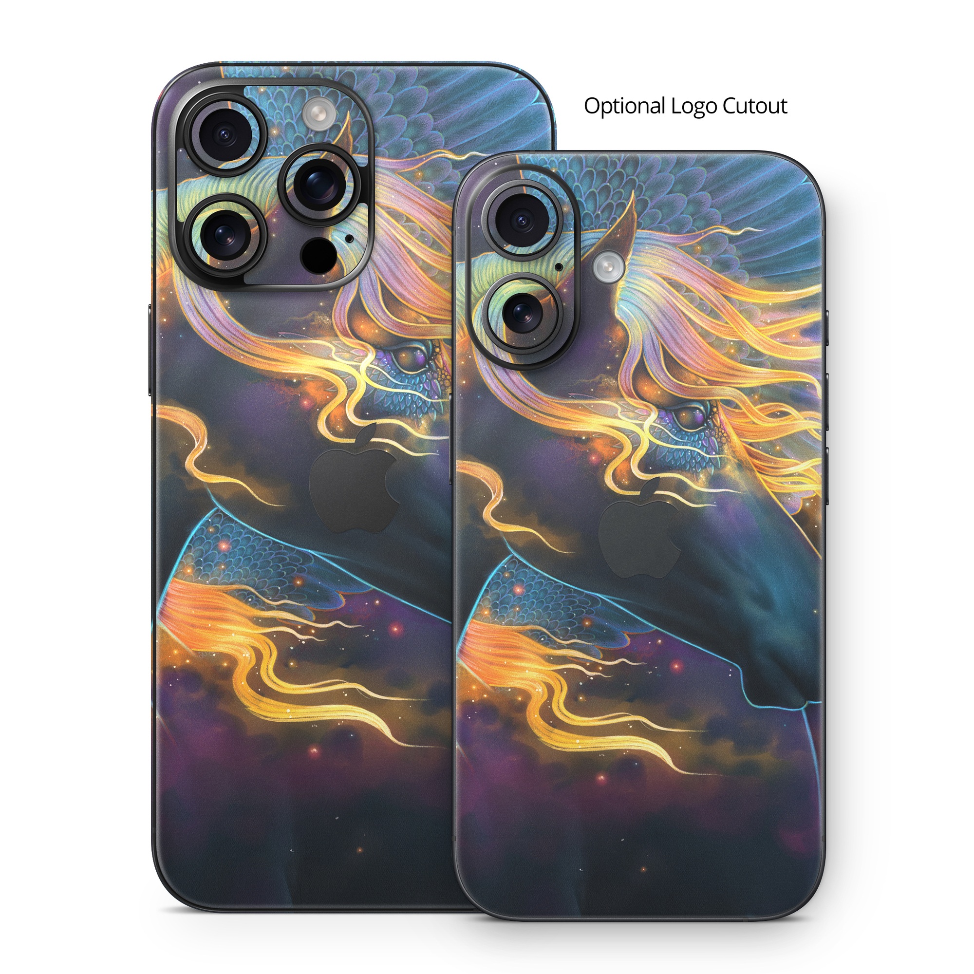 iStyles iPhone 16 Series Skin design of Organism, Astronomical object, Art, Electric blue, Space, Darkness, Liquid, Science, Graphics, Visual arts, with black, blue, yellow, white, orange, purple, red colors, and tagged with fantasy, animals, space, flames, horse, stars, constellations, sun.