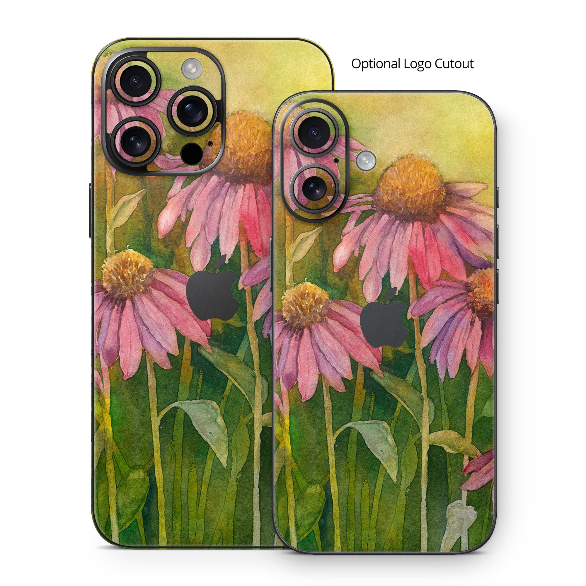 iStyles iPhone 16 Series Skin design of Flowering plant, Purple coneflower, Coneflower, Flower, Plant, Watercolor paint, Wildflower, black-eyed susan, Petal, Daisy family, with black, green, red, gray, purple colors, and tagged with flowers, fineart.