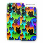 iStyles iPhone 16 Series Skin design of Black cat, Purple, Cat, Small to medium-sized cats, Pattern, Design, Felidae, Illustration, Art, with black, blue, green, purple colors, and tagged with animals.