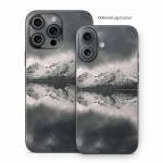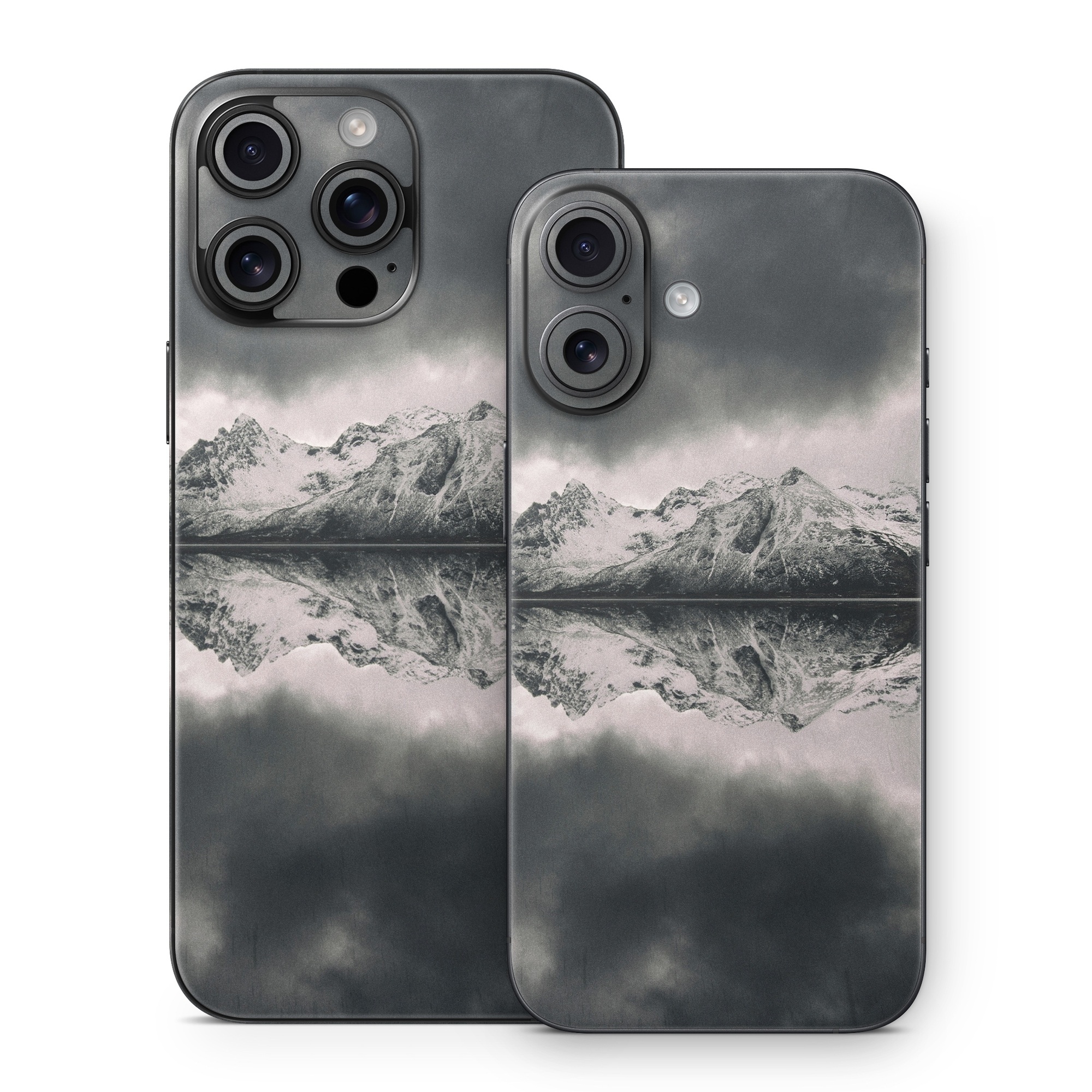 iStyles iPhone 16 Series Skin design of Sky, Cloud, Nature, Reflection, Water, Atmospheric phenomenon, Daytime, Black-and-white, Atmosphere, Calm, with white, black, gray colors, and tagged with nature, photos, dark, lake, landscape, mountains, photo, photography.