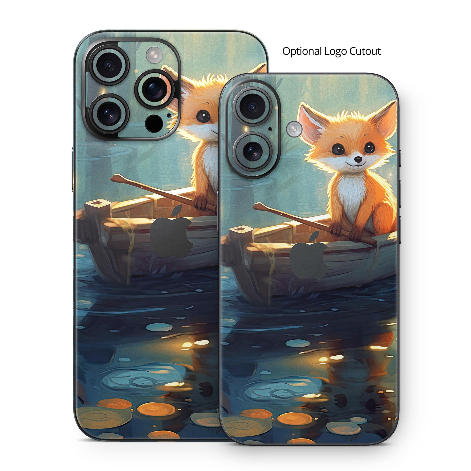 iStyles iPhone 16 Series Skin design of Water, Boat, Light, Nature, Organism, Orange, Cartoon, Watercraft, Art, Plant, with blue, yellow, orange, white, black, gray, green, brown colors, and tagged with fineart, animals, objects, fantasy, nature, fox, boat, character, water, lilies, paddle.