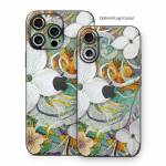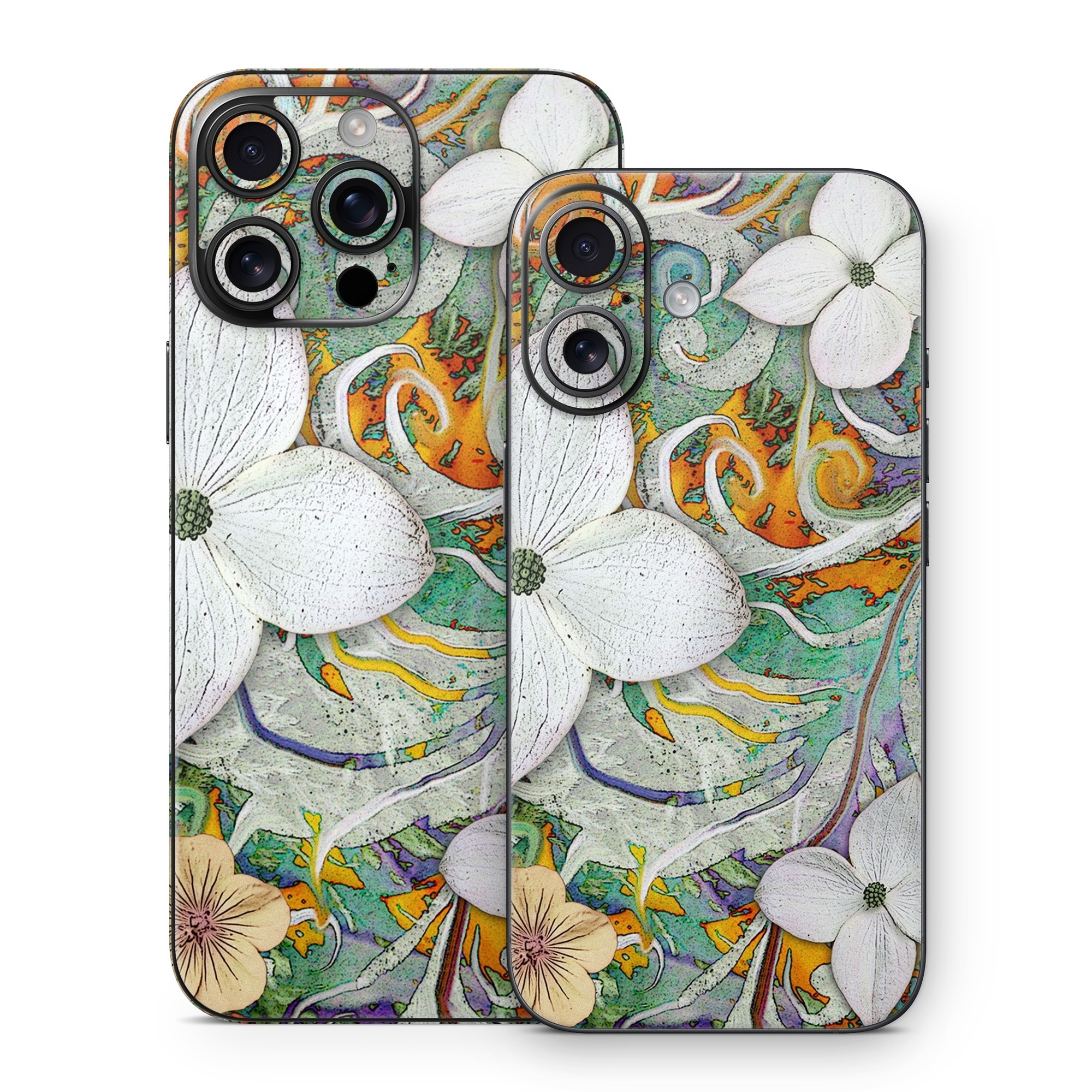 iStyles iPhone 16 Series Skin design of Flower, Pattern, Plant, Wildflower, Floral design, Petal, Art, Painting, Visual arts, Wallpaper, with gray, black, green, blue, red colors, and tagged with flowers.