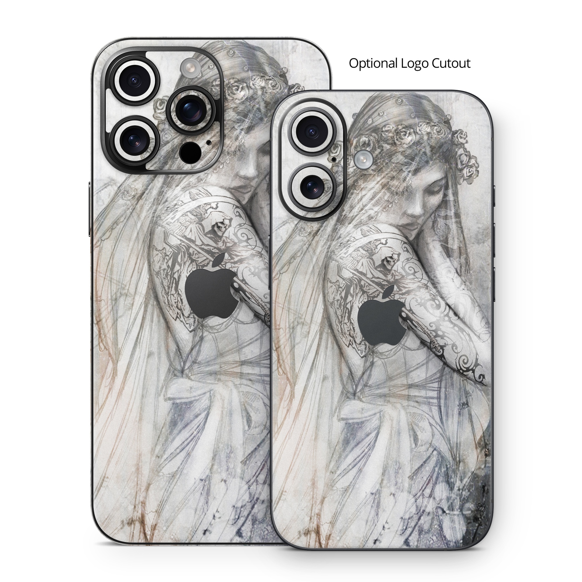 iStyles iPhone 16 Series Skin design of Lady, Art, Illustration, Drawing, Painting, Sketch, Mythology, Figure drawing, Long hair, Visual arts, with white, gray, black colors, and tagged with skulls, people, flowers, fantasy, death, ghost, goth, gothic, scythe, skull, tattoo.