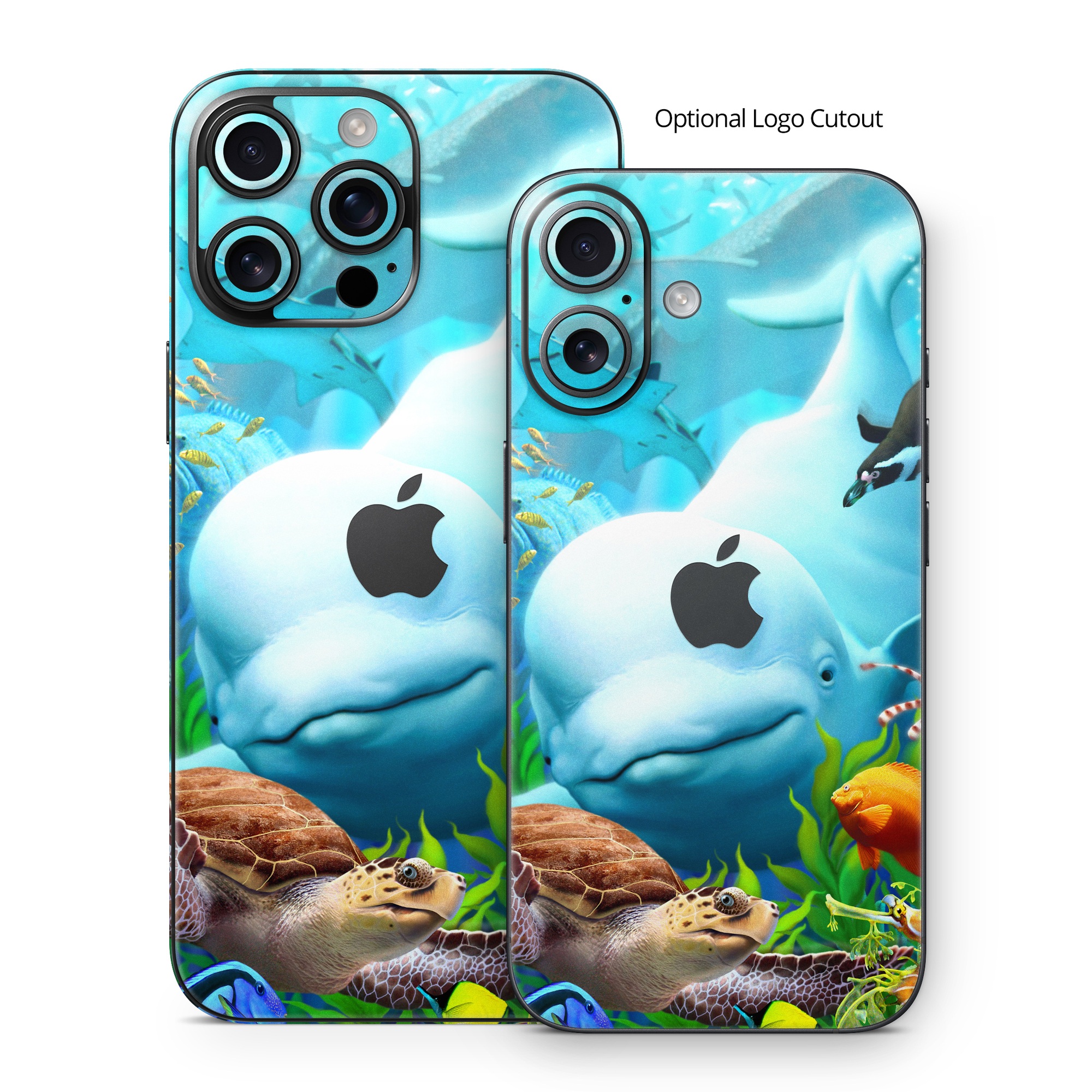 iStyles iPhone 16 Series Skin design of Green, Blue, Azure, Natural environment, Underwater, Organism, Mammal, Art, Marine biology, Aqua, with blue, green, red, white, brown, yellow, orange, blue colors, and tagged with animals, nature, dolphin, fish, ocean, sea, sealife, shark, underwater, water, whale.