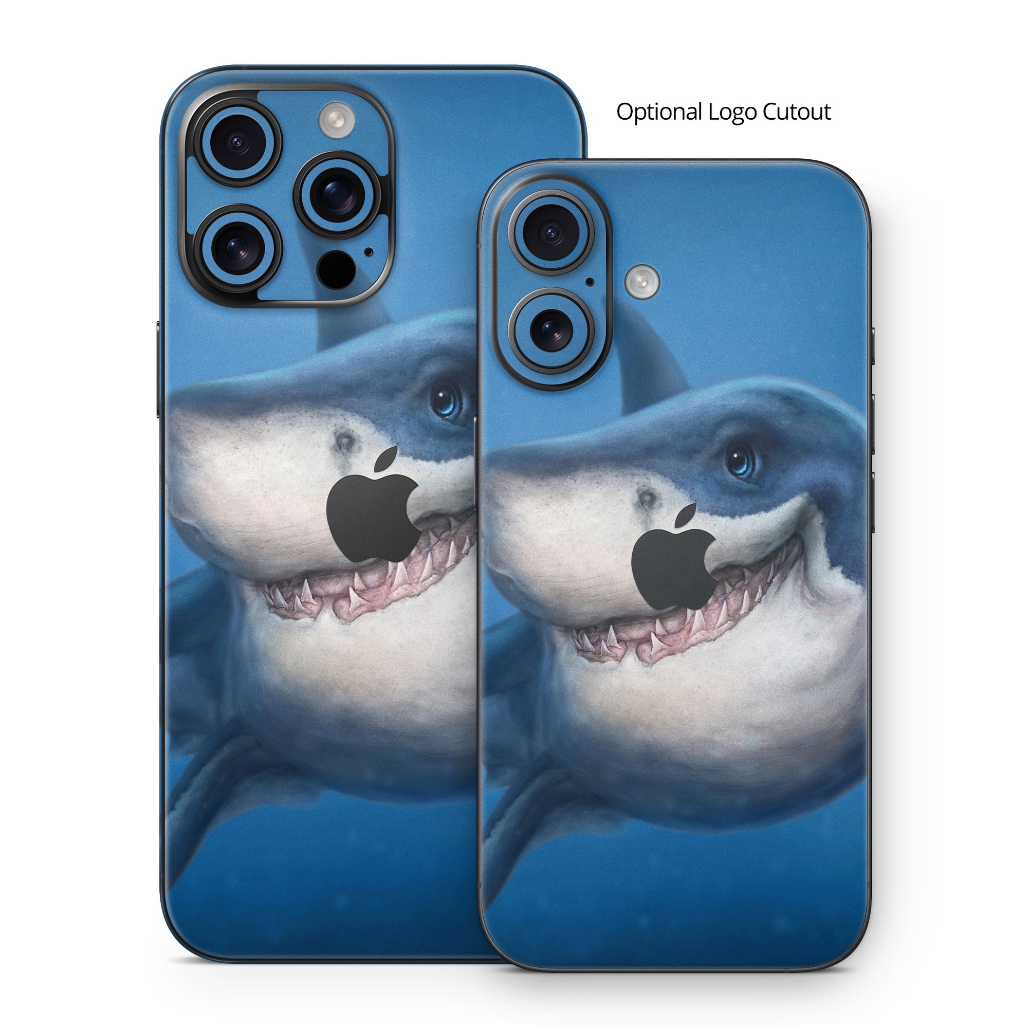 iStyles iPhone 16 Series Skin design of Fish, Great white shark, Shark, Tiger shark, Cartilaginous fish, Requiem shark, Lamniformes, Bull shark, Carcharhiniformes, with black, blue, gray colors, and tagged with animals, animals, ocean, sealife, shark, wildlife.