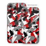 iStyles iPhone 16 Series Skin design of Red, Pattern, Font, Design, Textile, Carmine, Illustration, Flag, Crowd, with red, white, black, gray colors, and tagged with patterns, lookslike, space, fantasy, camo, geometric.