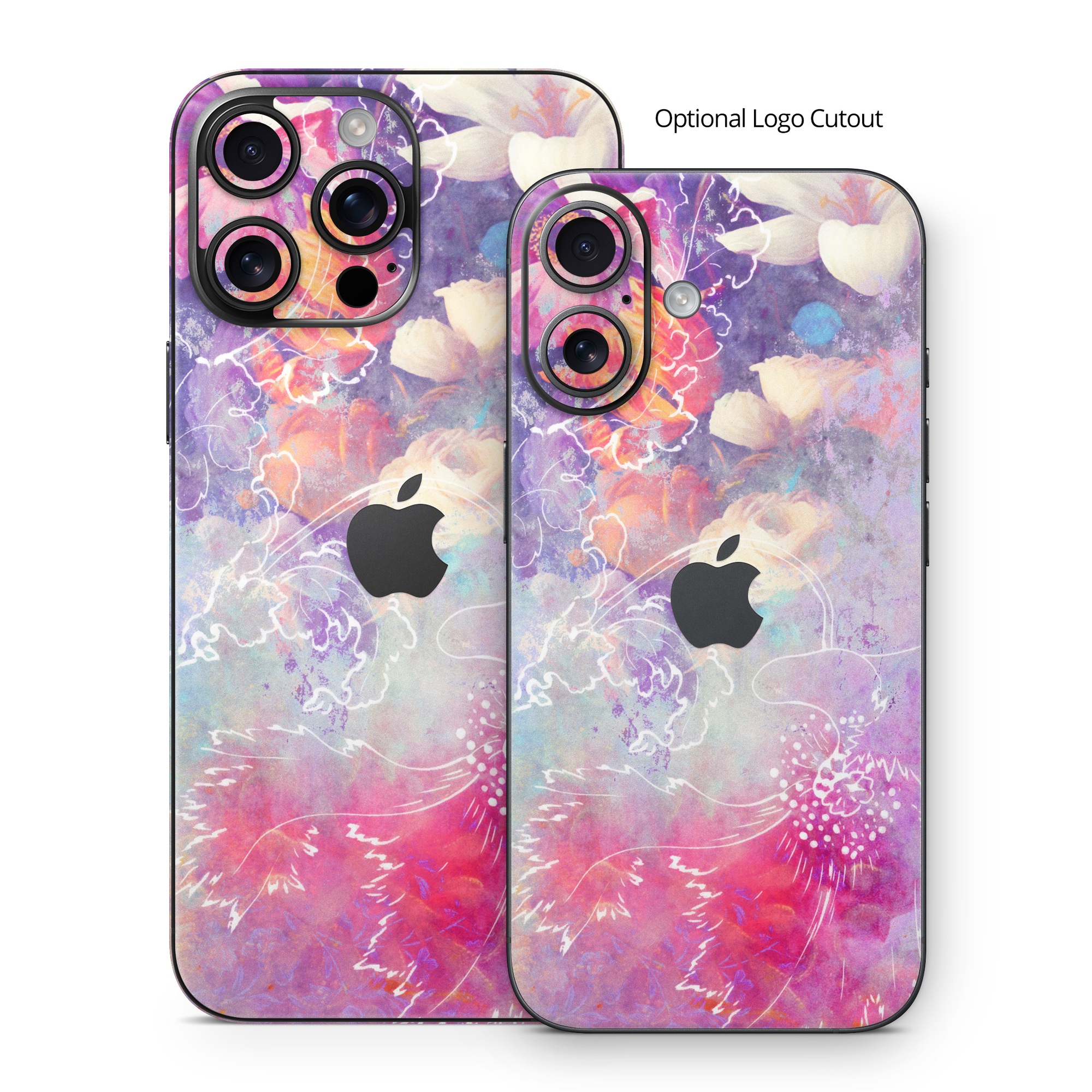 iStyles iPhone 16 Series Skin design of Purple, Violet, Pink, Graphic design, Illustration, Sky, Art, Design, Watercolor paint, Graphics, with purple, white, red, orange, blue colors, and tagged with flowers, floral, flowers, nature, outline, pastel, sketch.