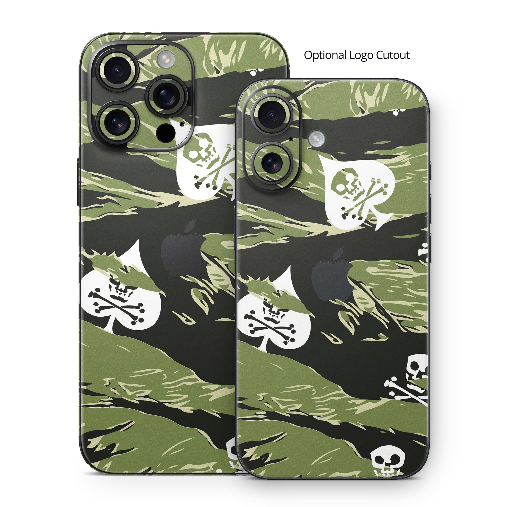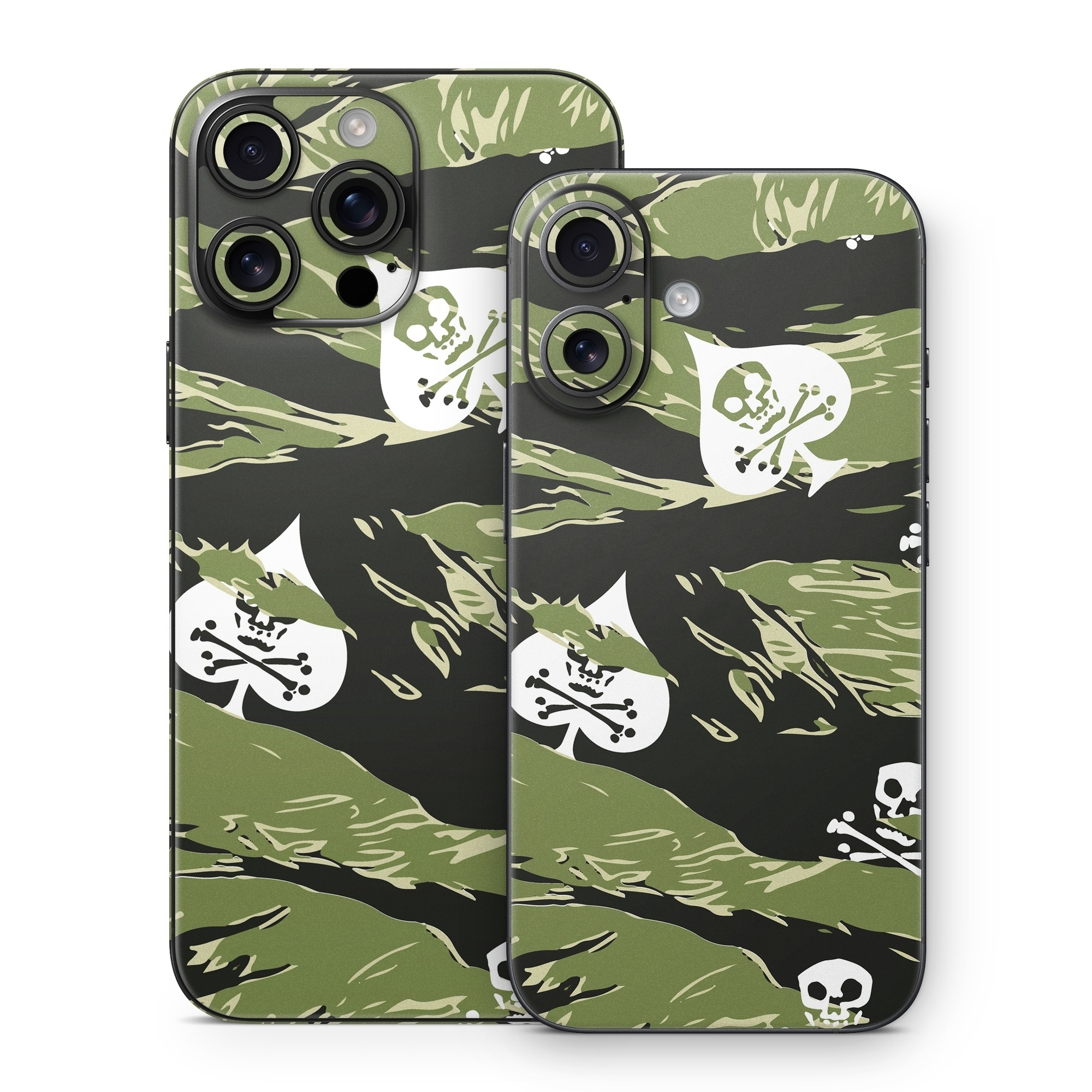 iStyles iPhone 16 Series Skin design of Military camouflage, Pattern, Leaf, Illustration, Design, Tree, Camouflage, Plant, Art, Branch, with black, white, green colors, and tagged with military, skulls, signs, patterns, athlete, fitness, gym, skull, skulls, spade.