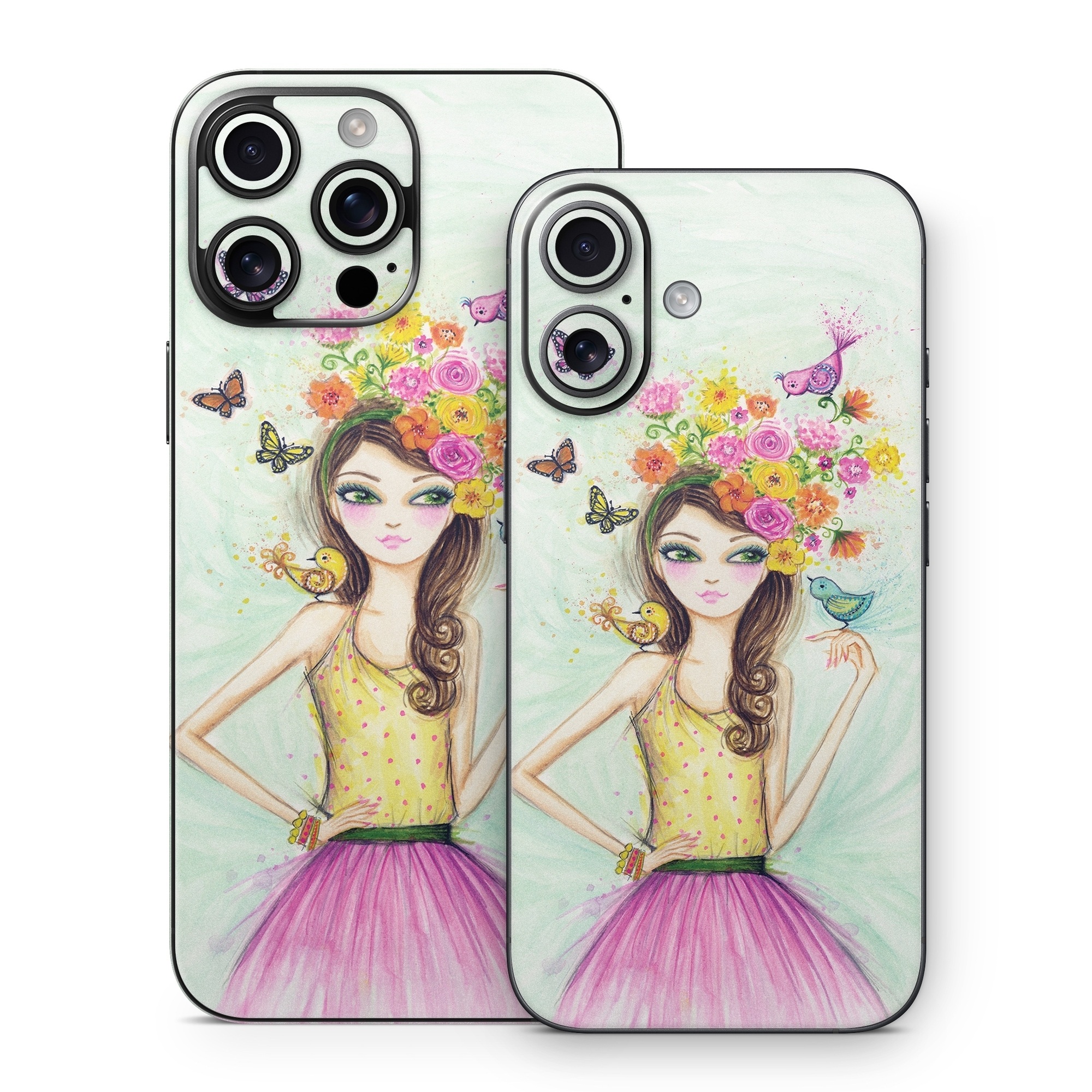 iStyles iPhone 16 Series Skin design of Pink, Illustration, Fashion illustration, Watercolor paint, Fictional character, Dress, Hair accessory, Wildflower, Costume, Plant, with blue, pink, yellow, orange, purple, brown, green colors, and tagged with people, fineart, animals, flowers, fashion, birds, dresses, fashion, flowers, spring.
