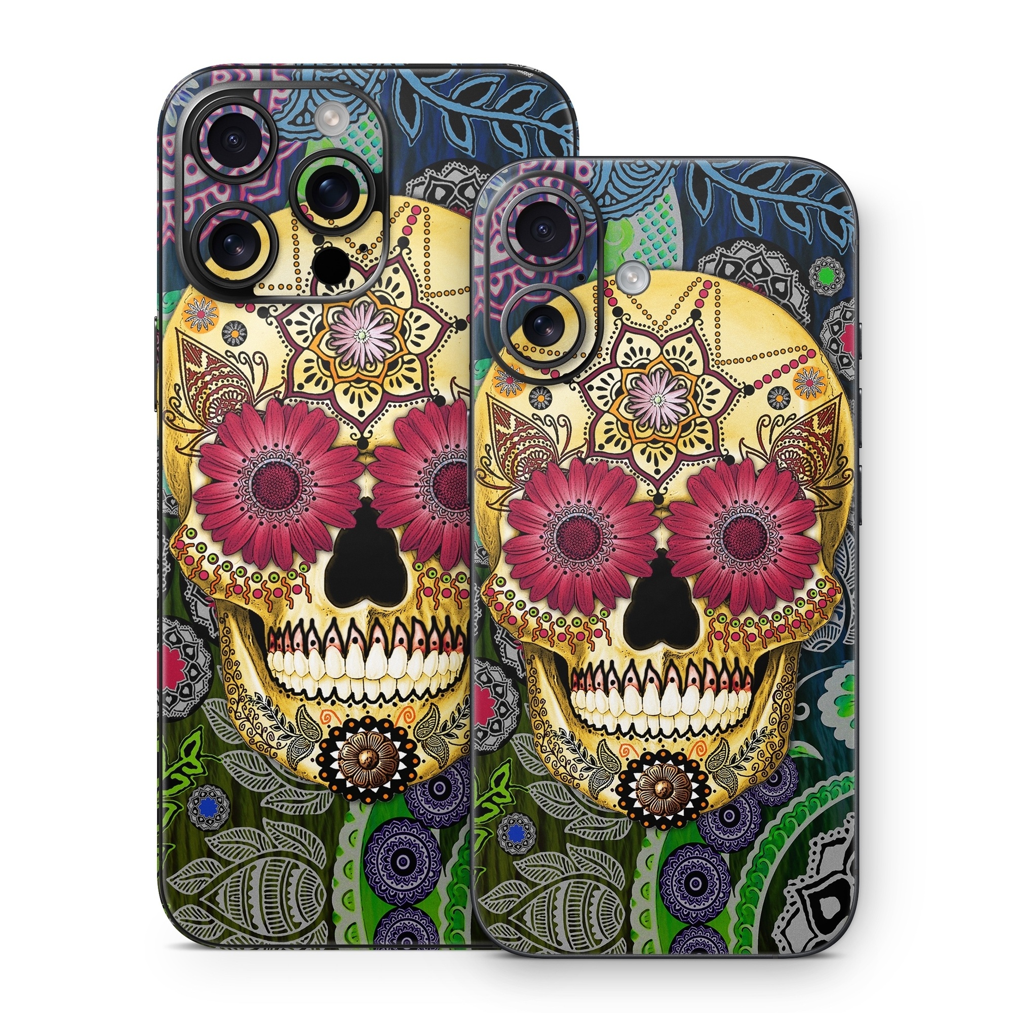 iStyles iPhone 16 Series Skin design of Skull, Bone, Pattern, Psychedelic art, Visual arts, Design, Illustration, Art, Textile, Plant, with black, red, gray, green, blue colors, and tagged with patterns, skulls, flowers, nature.