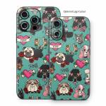 iStyles iPhone 16 Series Skin design of Cartoon, Pattern, Illustration, Design, Crowd, Textile, Art, with blue, brown, red, white, black, green, gray colors, and tagged with patterns, animals, flowers, objects, hearts, animals, dog, dogs, grunge, pattern, punk, retro, tattoo, tattoostyle.