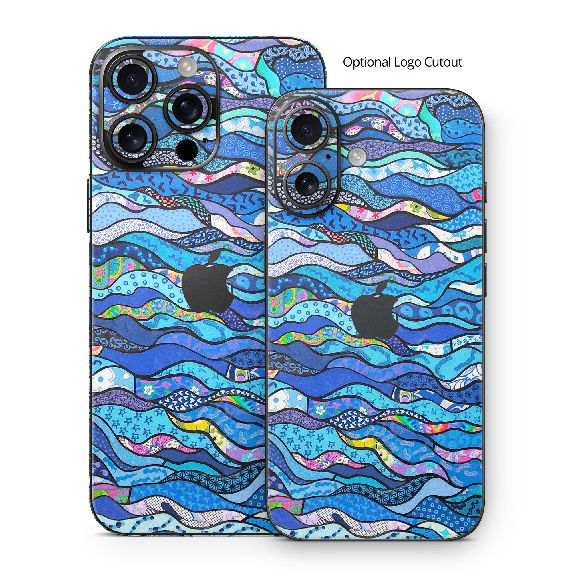 iStyles iPhone 16 Series Skin design of Blue, Pattern, Aqua, Water, Line, Design, Textile, Psychedelic art, Electric blue, with blue, black, gray, purple colors, and tagged with abstract, flowers.
