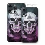 iStyles iPhone 16 Series Skin design of Skull, Bone, Illustration, Font, Jaw, Fictional character, Graphic design, Graphics, Art, with black, white, gray, purple colors, and tagged with signs, skulls, space, galaxy, geometric, goth, gothic, skull, space.
