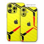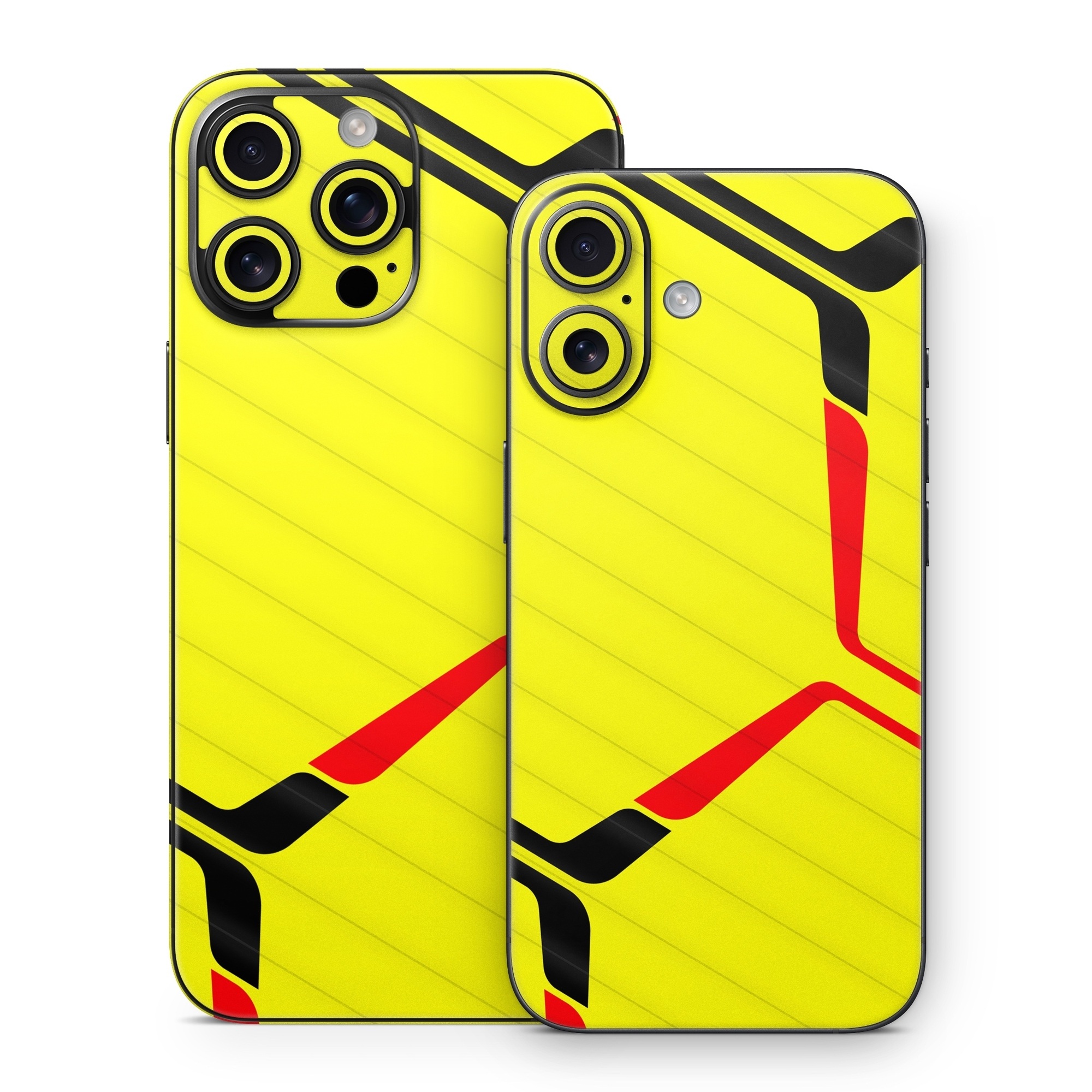 iStyles iPhone 16 Series Skin design of Rectangle, Yellow, Parallel, Font, Tints and shades, Wood, Triangle, Pattern, Graphics, Symmetry, with yellow, black, red colors, and tagged with patterns, hexagon, pattern, lines.