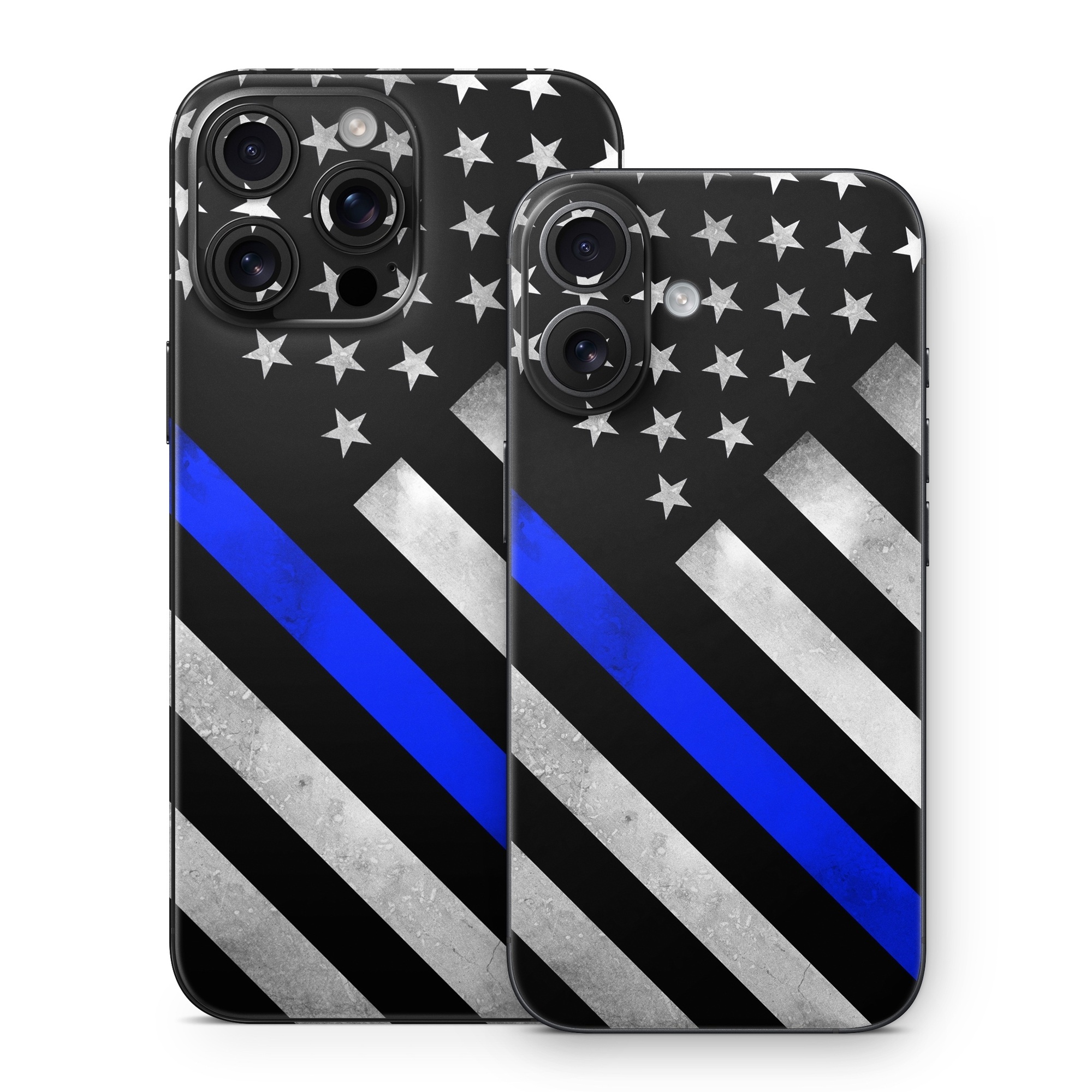 iStyles iPhone 16 Series Skin design of Flag of the united states, Flag, Cobalt blue, Pattern, Line, Black-and-white, Design, Monochrome, Electric blue, Parallel, with black, white, gray, blue colors, and tagged with flags, signs, firstresponder, flag, police, rescue, thinline.