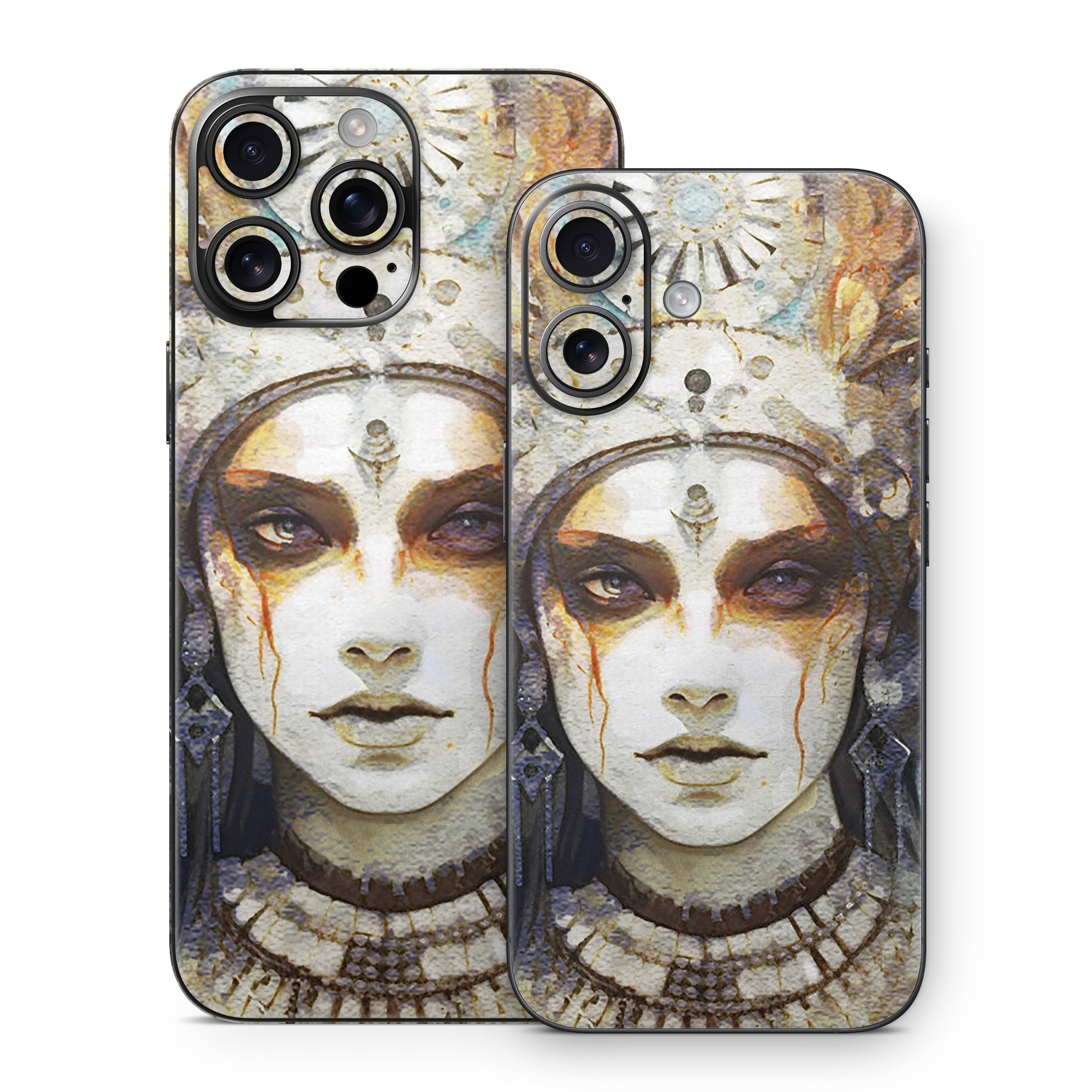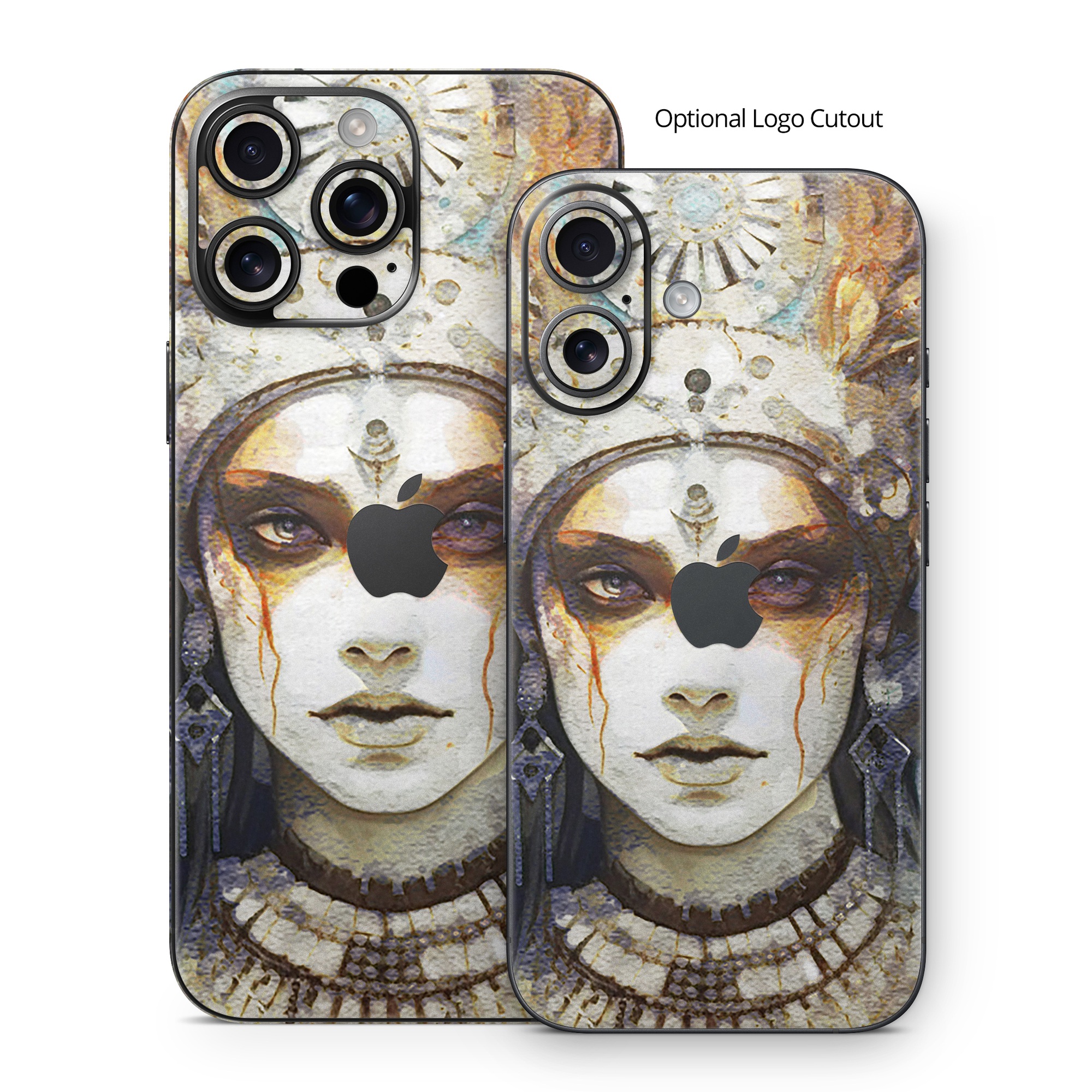 iStyles iPhone 16 Series Skin design of Eye, Paint, Eyelash, Painting, Art, Headpiece, Beauty, Feather, Illustration, Mask, with white, black, yellow, brown, gray, blue colors, and tagged with flowers, people, woman, .