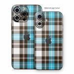 iStyles iPhone 16 Series Skin design of Plaid, Pattern, Tartan, Turquoise, Textile, Design, Brown, Line, Tints and shades, with gray, black, blue, white colors, and tagged with patterns.
