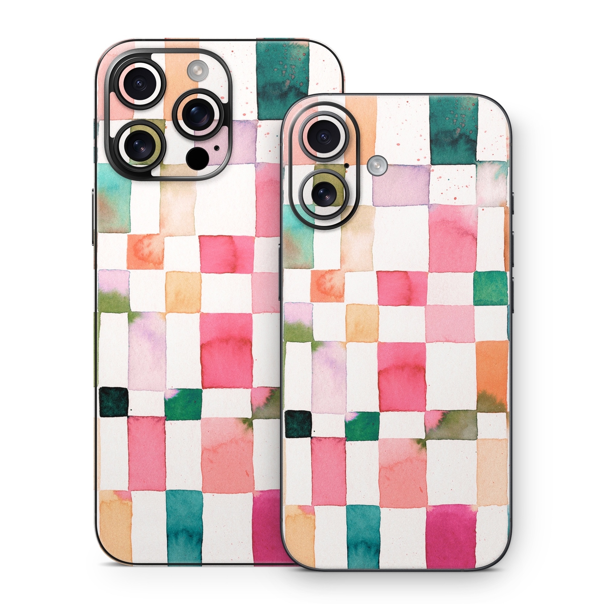 iStyles iPhone 16 Series Skin design of Brown, Rectangle, Product, Textile, Art, Pink, Line, Aqua, Magenta, Symmetry, with white, pink, green, red, blue, orange, purple colors, and tagged with patterns, checkers, geometric, pattern, shapes, squares, watercolor.