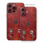 iStyles iPhone 16 Series Skin design of Font, Tints and shades, Bone, Art, Skull, Pattern, Creative arts, Carmine, Visual arts, Rectangle, with white, black, gray, brown, red, yellow, orange colors, and tagged with skulls, hearts, love, couple, perfect.