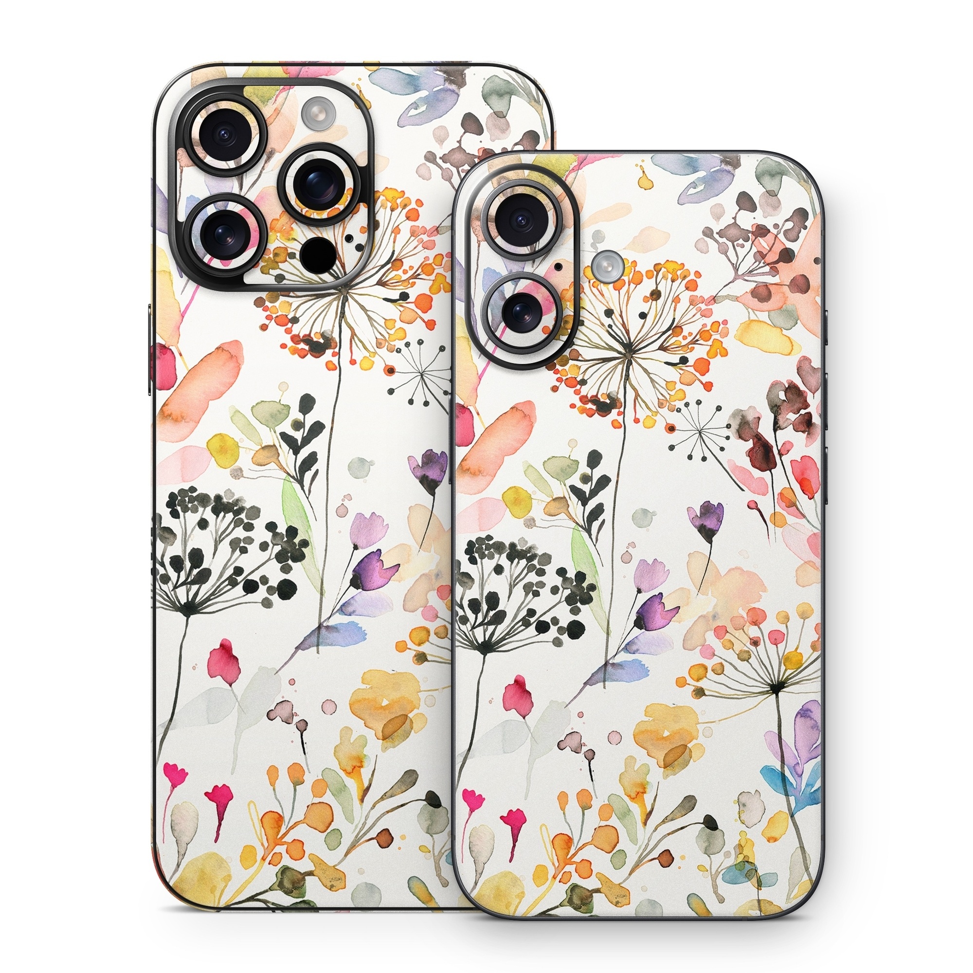 iStyles iPhone 16 Series Skin design of Flower, Petal, Rectangle, Branch, Creative arts, Plant, Line, Art, Painting, Font, with white, pink, red, yellow, orange, green, blue, purple colors, and tagged with patterns, flowers, nature, flower, flowers, garden, grass, nature, outdoors, watercolor.