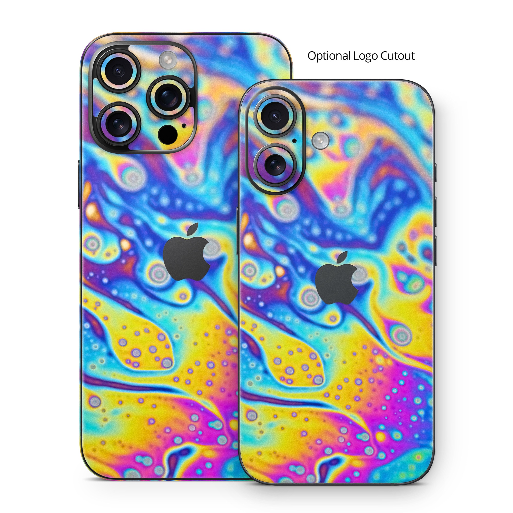 iStyles iPhone 16 Series Skin design of Psychedelic art, Blue, Pattern, Art, Visual arts, Water, Organism, Colorfulness, Design, Textile, with gray, blue, orange, purple, green colors, and tagged with patterns.